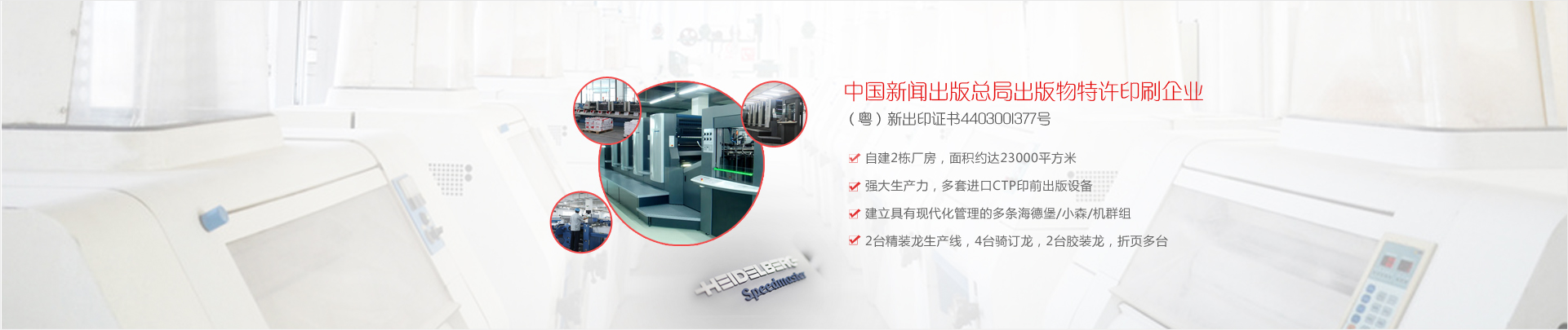 公司實力雄厚,設備先進。 聚集了許多高等院校的尖端高級印刷專業人才,擁有國際頂尖的、全球最大的成套印刷設備— - 德國海德堡-對開四色、五色、雙色、單色、四開四色機等的主體印刷設備, 擁有高水準后道加工系統—— 全電腦控制的斯塔爾折頁機、 STAHL 自動折頁機、 全自動鎖線機、 全自動騎馬訂聯動機、馬天尼膠裝龍、 程控切紙機、環(huán)保型過膠機、啤機等 精良裝備,整套印前印后設備。